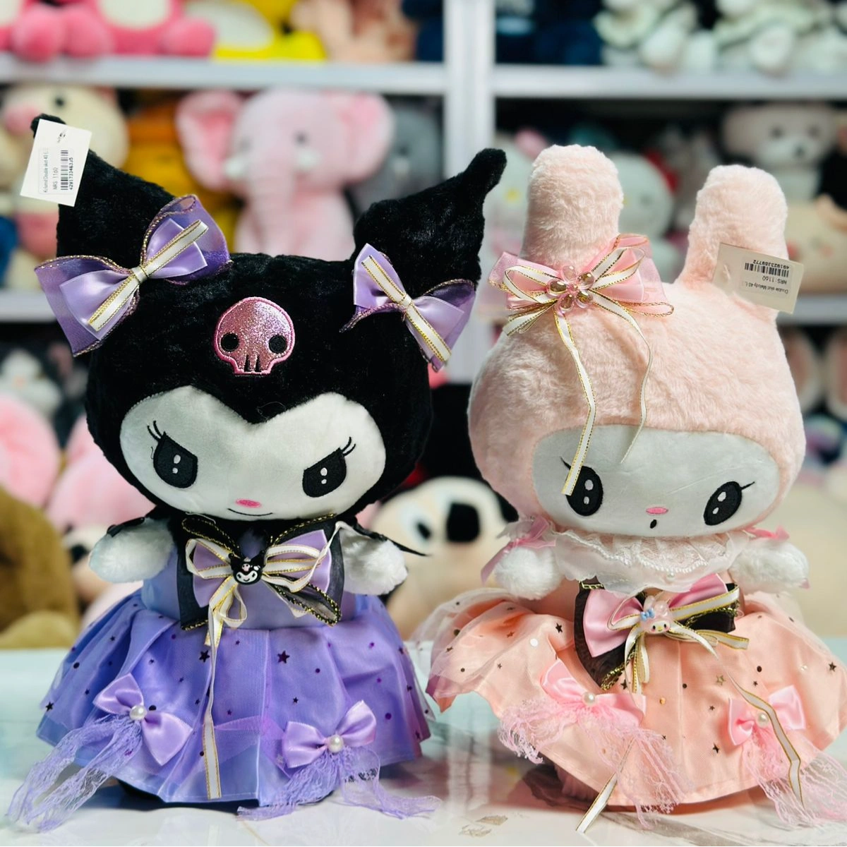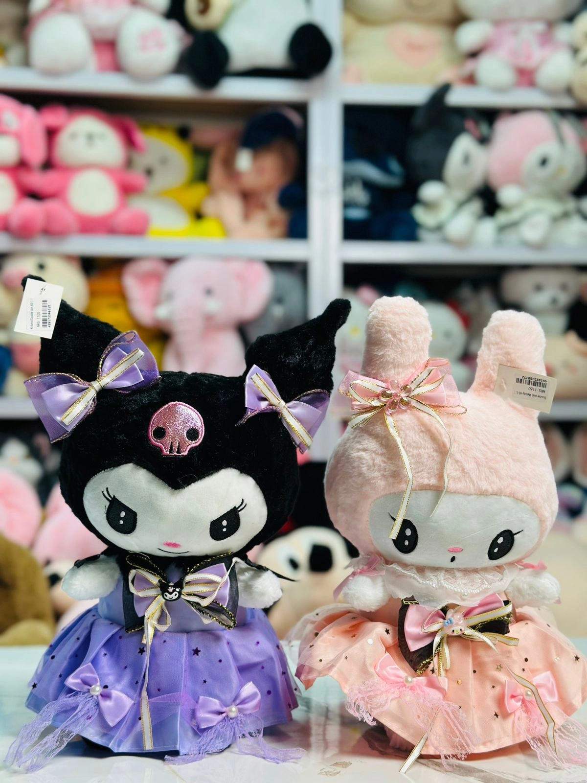 Bring home the ultimate dose of cuteness with our Kuromi and Melody Plush Dolls, now available at Dollmandu! These adorable anime-inspired plushies come dressed in beautifully detailed outfits — Kuromi in her bold purple dress with ribbon accents, and Melody in her soft pink gown with delicate lace and bows.