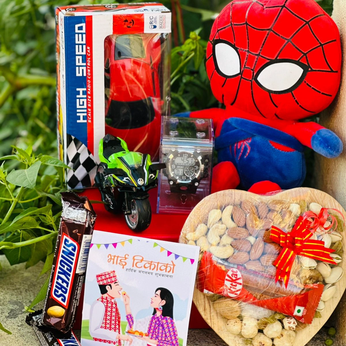 Celebrate the sacred bond of love and protection this Bhai Tika with our Bhai Tika Combo Set for Boys β Special Brother Gift Hamper 2025 ππ, exclusively available at Dollmandu.com. This beautifully curated combo is the perfect way for sisters to express their affection and blessings for their brothers on this special occasion.