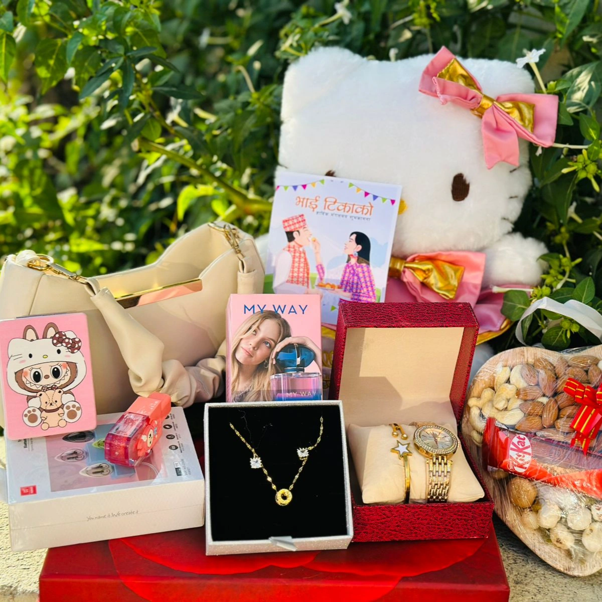 Includes teddy, watch, jewelry, perfume, bag, and chocolates