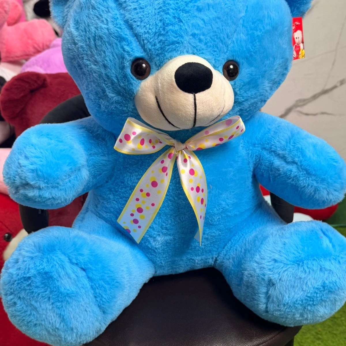 Bring home a splash of color with this adorable, bright blue teddy bear. Designed with soft, high-quality plush fabric, this bear is as huggable as it is eye-catching. Its friendly expression and charming details make it an ideal companion for children or a unique piece for collectors of kawaii items.