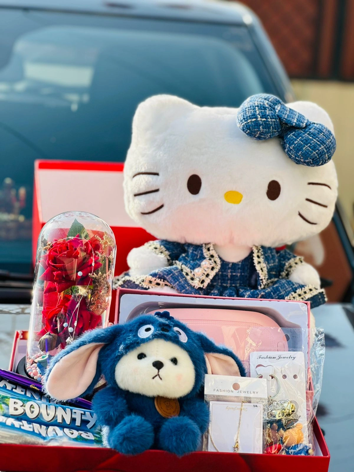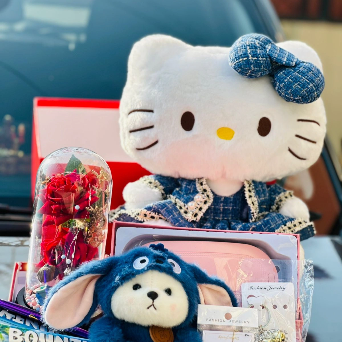 The preserved red rose inside a glass dome represents everlasting love — just like your bond. The cute Hello Kitty plush and the fluffy blue bunny add a playful and cozy vibe, perfect for hugging and keeping close. The stylish fashion jewelry adds a touch of elegance, while the chocolates and cute pouch make the combo both sweet and useful.